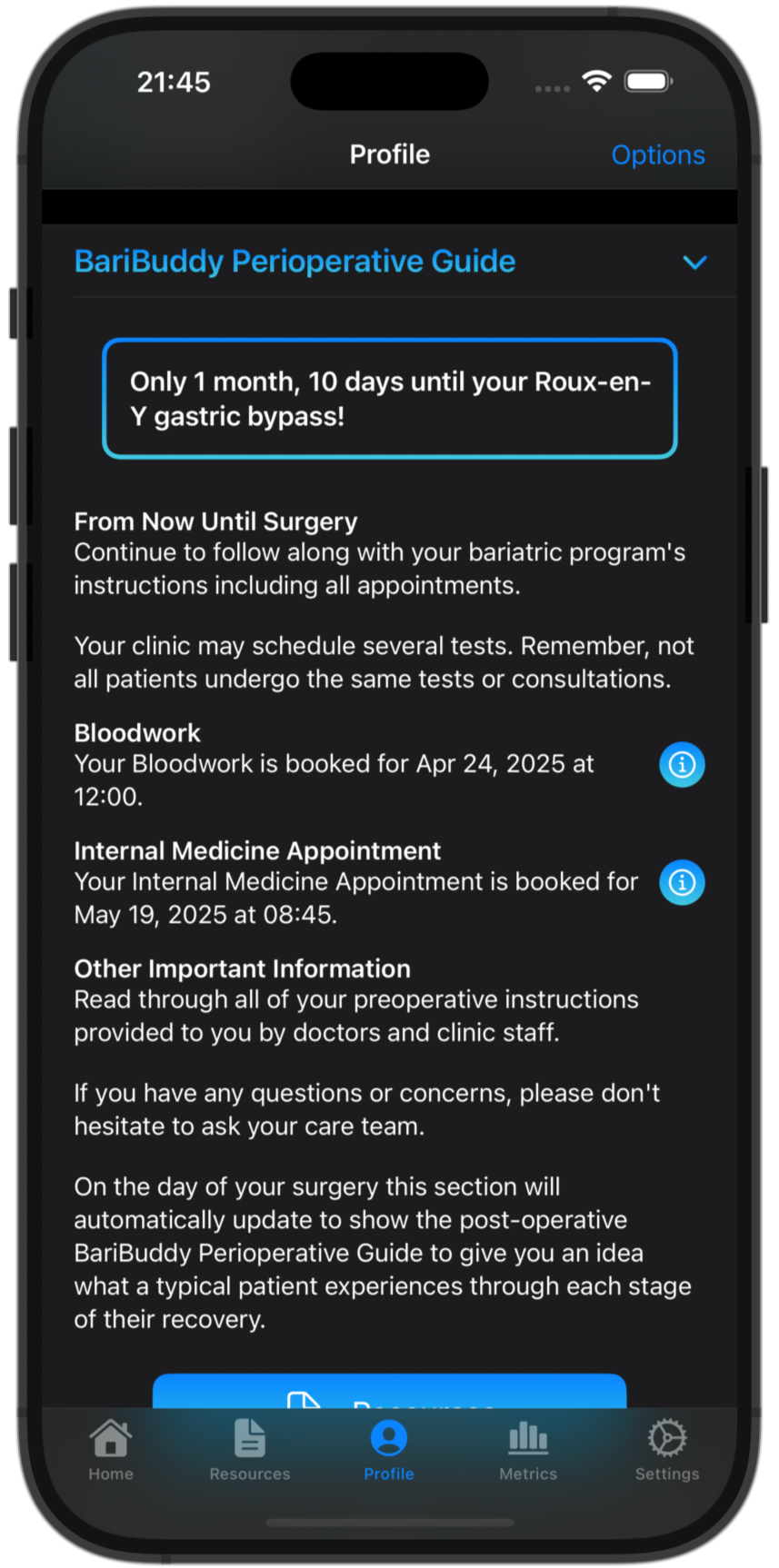 Set and monitor daily targets for fluid, protein, and calories to stay on top of your health.📖 BariBuddy Perioperative GuideA brand-new section designed exclusively for bariatric surgery patients:Information Hub: